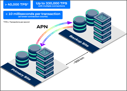 An APN enables real‑time, zero‑lag replication between primary and backup data centers separated by approximately 500 km, sustaining high transaction throughput and sub‑10 millisecond latency under defined conditions.