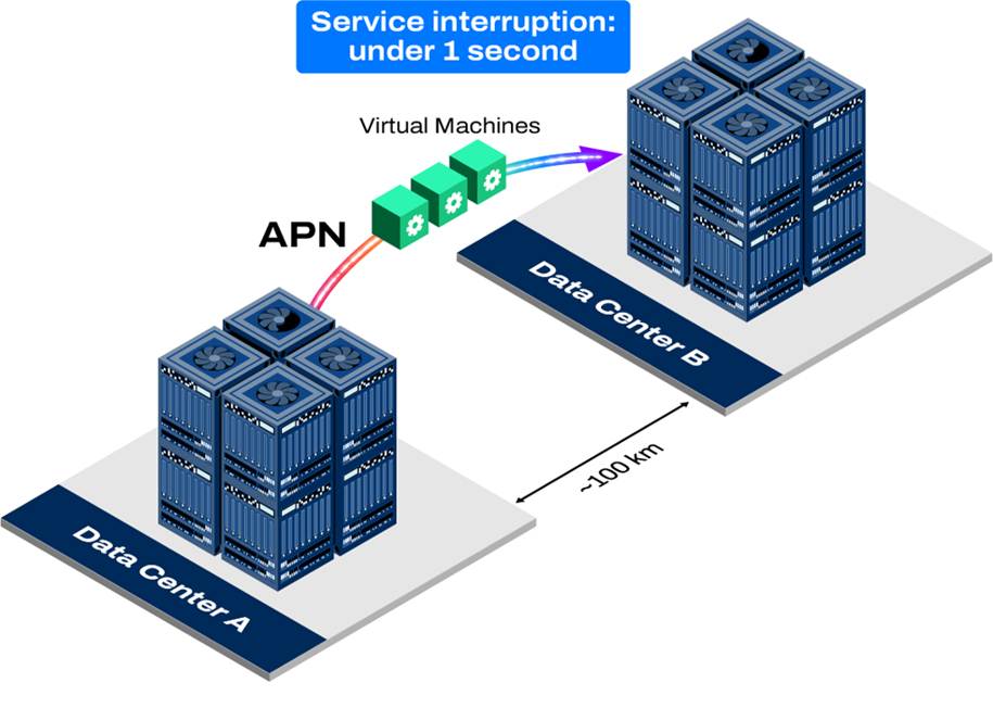 With an APN, cloud infrastructures can be deployed across multiple sites in the same region. Subsequently, virtual machines can be migrated between these sites with minimal service disruption. In this way, the system functions as if all resources were part of a single operational environment.
